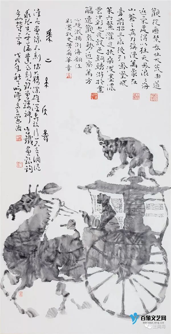 文人画十分重视以诗入画,古希腊诗人西摩尼德说:“画为不语诗,诗是能言画。”宋人张舜民也说:“诗是无形画,画是有形诗。”苏东坡有“诗画本一律,天工与清新。”诗与画的结合是传统文人画的基本要素,也是文人画家对中华民族艺术史的巨大贡献,已经成为中华民族艺术重要的传统特色,在世界艺术中独树一帜。这正成为王阔海先生在创作新汉画时所必须的遵循的不二法门。以诗情生画境,画境随诗情而生动,诗是文人画的灵魂,诗的灵性可以引领画家触景生情,再由情生意,以意构思章法用笔用墨等等方面皆深深浸入诗情的意境中,即“心有所忆谓之意。”(黄帝内经语)这种“意”的产生是画家的诗情、诗才、诗心的养育而成,画家以诗人之心观物,这物便被诗意化了,诗意化的物象已升华为超越客观物象之表象,而上升为一种传情达意的生命载体,这一切过程均以诗人之心统领着整个过程。也正是文人画所强调诗与绘画的重要性,几十年来王先生始终以诗人之心观物,每每触景均有妙句酿成,特别是他平素为人处世、治学修为的过程中均有大量的诗词作品伴随。特别是在探索新汉画的过程中,总是以诗情哲理运思构图。其中他的《古汉画石刻礼赞》长诗最为精妙,洋洋洒洒气势恢宏,意味隽永,将汉画像石的精要俯仰拾得,心游太玄,纵横往还,豁然贯通,尽显古汉画之神采,其中境界耐人寻味。遍览王先生的诗词作品,其中不乏佳句珠联,妙不胜收,如“大汉精神出大化,云烟满纸动灵犀。”“狂飙破格迷天野,巨眼搜新慕汗青。”“贯古通今涵六义,雄浑鸿懿索五经”等等。真可谓超以象外,得其环中,吟咏性情,华章天成、慧心偶得、天俯风动、象外之象、意外之意、耐人思、耐人品、耐人悟。王先生有云:“坚持诗画同律、书画同源、坚持用笔规律,重书卷气,重笔墨诗序语言的意境营造,坚持中国文人画的诗书画印四者并修的致学规律是我探索新汉画的四原则。”从中我们可以看出王先生对于诗词在新汉画中的重要位置。下面我们在来看看王先生是如何在新汉画中实现“书画同源”的,他在创作新汉画过程中始终坚持写意绘画的书写性用笔,特别是他需要从书法中体悟出用笔用墨的韵律和节奏,还有书论中所强调的风骨、意匠、情调、品次等等注入新汉画的创作实践中。纵观王先生对书法的全面修炼,可以看出他是亲历了王国维关于诗的三个境界,即从“望断天涯路”到“为伊消得人憔悴”最终达到“蓦然回首,那人却在灯火阑珊处。”的最高境界。在他研习书法的过程中,他上溯古籀、下追明清、广积博收、厚积薄发,在书体方面从甲骨文、金文大篆、汉隶、汉简、章草、楷书、行书、大草无所不能、无所不精,形成了属于自己悠然淡远,平和浑穆、迥异流俗的书卷之气象的总体风格。他在甲骨文篆隶方面着力尤甚,他的用笔如锥划沙,铁划银钩,力透纸背,形成了古朴俊逸、浑穆高古之气象。做到了在传统中求变化,在变化中见传统的书法创作原则。我十分欣赏他笔下的行草书、任性情逍遥挥洒,使转得法,张弛有度,时作龙腾蛇奔,虎啸熊吟,时作云行水绕溪流涓涓,时作云崩石裂雷声滚滚。妙在灵犀,妙在天籁,妙在只可意会不可言传。真正体现出了易学“万物负阴抱阳,冲气以为和”的核心,以及老庄的阴阳互易的宇宙哲学。如他所说在书写的过程中“心松才得手松,手松则自由出。”只有心松和手松才能充分体现出无为而无不为的散淡自由精神汇于毫端。如美学家付景生评论王先生其书法“有先秦英气、汉魏风骨,晋唐气象,宋元格调,明清趣味。”付先生评论中肯,一言蔽之。