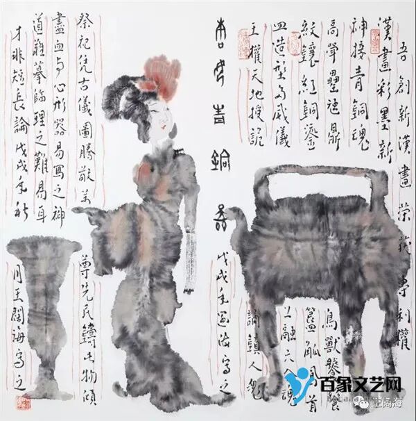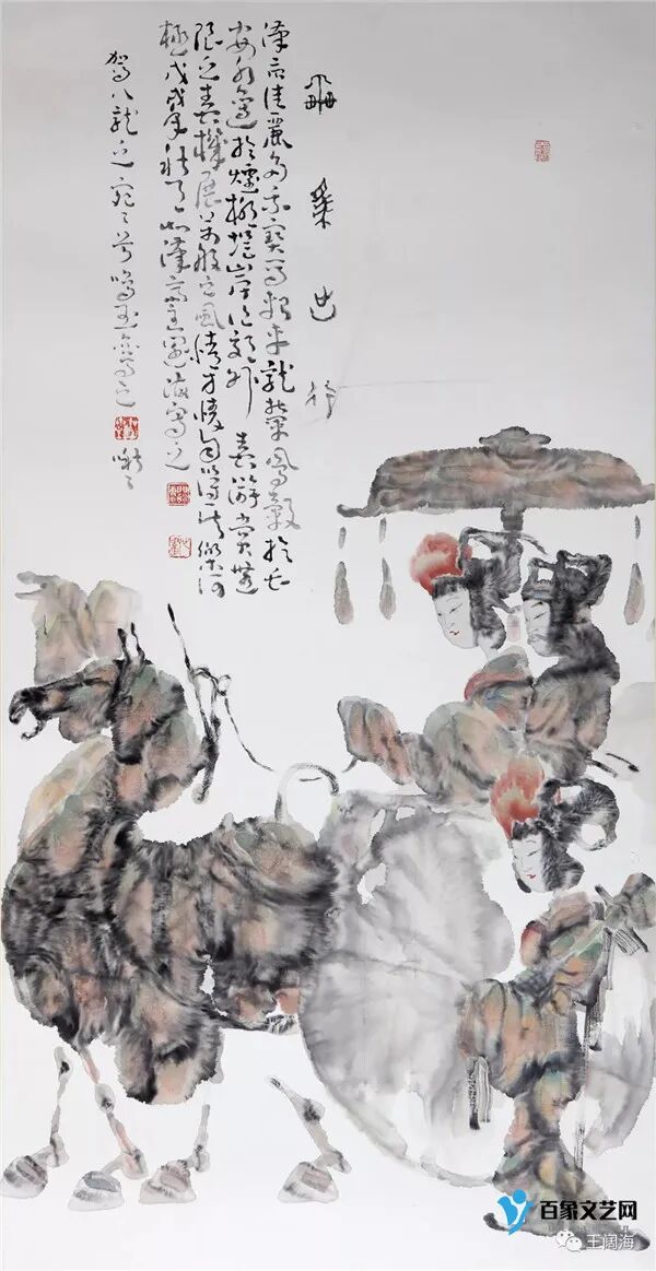 五、新汉画的启示 王阔海先生历时三十多年苦心经营,终于实现了将古汉画像石艺术到新汉画转换,又将新汉画与文人画写意笔墨艺术语言的转换,它给我们的启示正如朱熹的“问渠那得清如许,为有源头活水来”。我们试想一下,两汉古画像石艺术遗存,经过王先生刻苦探索而能穿越时空从先秦走来,转换为今天当代人进行艺术创作的参照,并能形成一种具有当代艺术审美特征的绘画形式,成为为时代塑魂,为时代立传的载体。这种转换过程正是雄辩的证明了王先生新汉画给我们的启示: (一)、凡是在中华大地上发生的各个不同时代的文化遗存,绝对不是只能摆在博物馆供人参观瞻仰的文物,它们都是饱含着各个不同时代的文化基因,这种文化基因一但被唤醒它必然会“当春乃发生”而成长为充满深厚文化精神的参天大树。具体点讲,凡是属于我中华民族祖先所创造那些无法计数的饱含中华传统文化精神的各个不同时期的历史遗存,如彩陶、甲骨、岩画、青铜、三彩、陶俑、古建等,皆可以成为我们今天艺术家攀登艺术巅峰的阶梯;皆可以成为我们今天开创艺术新纪元的崇高起点;皆可以成为我们今天艺术家进行艺术创作的最好参照系。又可以成为那些数典忘祖,自毁家庙的洋奴的一部教科书,还可以成为那些食古不化者的一剂良药。我们对传统文化抱以敬畏之心,绝对不是狭隘的民族主义者,也不是保守派。我们认为古代文化遗存中有精华亦有糟粕,必须以历史唯物主义史观来正确的分析事物多重性,是需要我们在艺术创作的实践中给予正确区分,实践是检验真理的唯一标准。 (二)、从近现代中国美术史来看,二十世纪上半叶,由于清王朝退出历史舞台,随之皇家审美体系的终结,蔡元培推行的西方艺术教育模式,陈独秀的“美术革命”还有“文化梳理论”、“罪为文人画论”、“中西融合论”还有后来的各种思潮运动等,先后百年的中国画四次大争论,其中的进步意义不言而喻,但是其中的负面影响也是根深蒂固的,可以说四次大争论无以例外矛头直指文人画,从此以后文人画成为众矢之地,使得很多文人画家生不逢时,使得几千年形成的文人画这一艺术结晶被批判,被打击与谩骂。从“无可奈何花落去”到“漏船载酒泛中流”的窘境,不能不使我们扼腕叹息!然而,王先生新汉画的诞生又一次证明了对于传统文化遗存,敢于充分的利用,并挖掘出其中内在的深厚文化学内容,就能与时代精神相结合,就能焕发出一种强大的生命力。如孔子曰:“温故而知新,可以为师矣”。我想,只要国人的血液中还遗存着祖先文化基因;只要国人的生命中还存留着先祖的原始基因;只要国人的生活中还信守着儒释道传统基因;只要国人还在使用汉字的记忆基因,文人画就不会消亡。因为它是中国绘画艺术真、善、美的最高表现形式,因为它是具有开放性,自由性,发展性,它会随着时代进步而不断地吐故纳新,不断自我进化,必然会永葆青春活力,大木常青。这就是王先生新汉画给我们的两点重要启示。 六、新汉画的学术价值和现实意义 下面我们再分析一下新汉画的学术价值和现实意义,我首先要列举两位近代美术的巨擘,即潘天寿和齐白石,他俩人都是复兴文人的大师巨匠。他们是近代美术史最有学术价值和现实意义的代表人物,潘天寿学术价值在于,以他“一味霸悍”的美学追求,以折铁屈金的方笔铁线,彻底改变了在他之前的孱弱低迷的绘画风气,给当时的画坛吹进一股“强其骨”的时代新风,开始了中国画的新纪元,成为改写当代美术史的画家兼教育家,是建国以来具有里程碑意义的一代宗师。另一位齐白石先生,他老人家的学术价值在于,他从一介布衣,通过自己的刻苦努力,成长为一名具有诗,书、画、印四绝的文人画家,从传统笔墨中独立出自己“齐家样”,从生活提炼出旧文人画家不耻的素材,扩大了文人画的表现领域,将传统文人从书斋中解放出来,走向民间,走向现实生活,用他独创大红大黑的强烈色彩对比,为文人画的复兴添上一抹亮丽的曙光,而成为引领文人画走向现代的旗手。那么,我们再来看看王阔海先生新汉画的学术价值,他的学术价值反映在他能将传统笔墨技巧与古汉画像石艺术的转换方面,是“古为今用,推陈出新”的典范,将古代文化遗存转化为具有时代特征的探索者,从而为中国美术史贡献出了一种全新绘画技法,一种特殊的没骨法绘画符号,他又将这种特殊的绘画技法和艺术符号与文人画的四绝要素相结合,在漫长的艺术探索实践中将自己的人品、学问、才情、思想臻于完善。使其绘画作品达到了立论精微,学养醇厚,人品纯正,意匠高华之境界。为新时代文人画发展探索出一条新途径,为丰富中国人物表现技法绘画增添一种新技法和表现形式,为复兴文人画探索出一条具有深远意义的艺术创作之路。而更难能可贵的是,他能自觉将自己畅怀抒情的文人情结与家天下的大情怀相融合,使他新汉画成为为民族谋复兴立传,为实现伟大的中国梦鼓与呼,充分地展现了一个时代艺术家的使命与担当,这就是新汉画所具有学术价值。 我想在我还没有谈及新汉画的现实意义时,我想先请诸位共同重温韩国艺术理论家金兑庭先生对于中国画坛现状所提出的忠告,他说:“中国美术最重要的不是油画,也不是国画,更不是其他什么画,而是文人画,文人墨客画是中国艺术的灵魂所在,中国哲