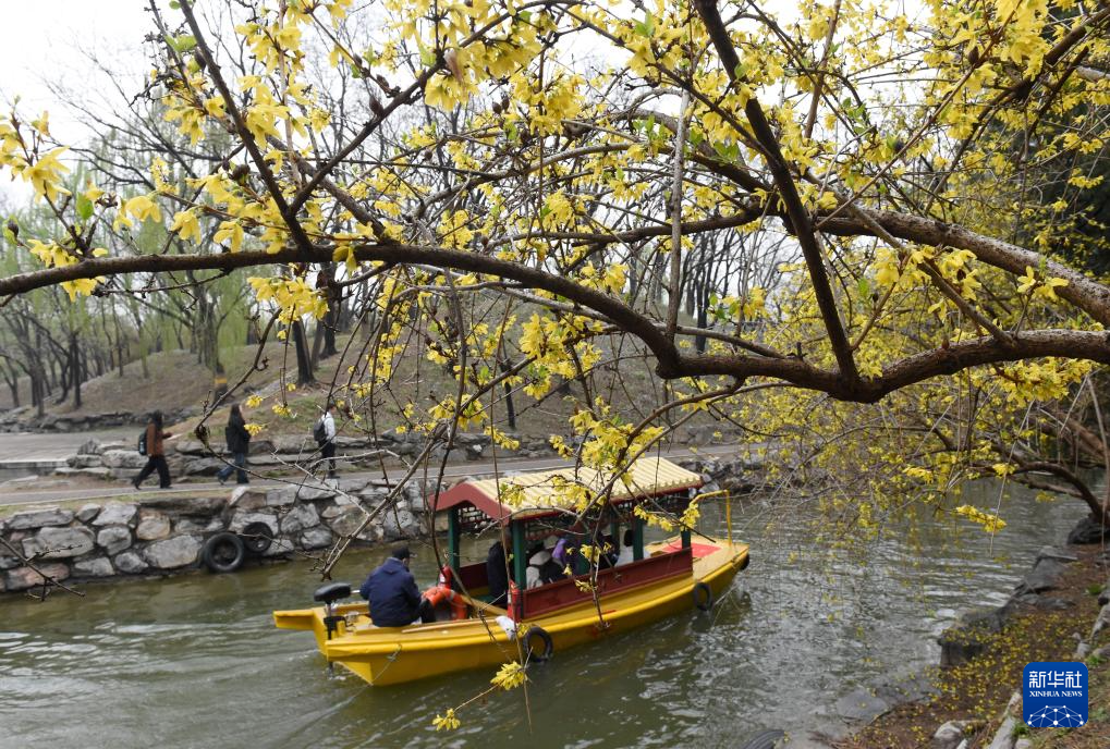 4月9日,游客在北京圆明园踏青赏花。