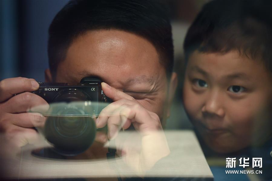 刘杰(左)在浙江博物馆拍摄展出的南宋青瓷“马蝗绊”(2019年12月7日摄)。 新华社记者 翁忻旸 摄