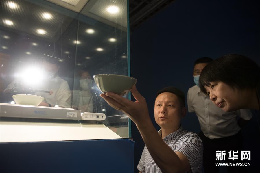 刘杰在浙江博物馆将自己做的碗(上)和展出的南宋青瓷“马蝗绊”比较,以进行改进(2019年12月7日摄)。 新华社记者 翁忻旸 摄
