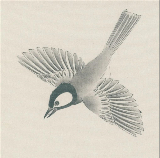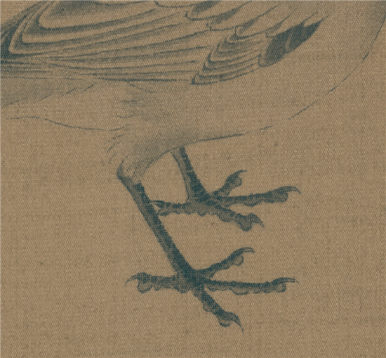 比如禽鸟的喙及爪是鸟类形态中最为坚硬与锋利的部分,而羽毛之中,尾羽、飞羽、复羽以及头颈胸腹的羽毛的质感也各有不同,这些不同在勾线中要有反映,但它们之间并不是一种简单的对应关系。而且,对于勾线与物象质感精神的关系,仅仅从羽毛上进行区分还是一种比较肤浅的认识。要通过羽毛,表达出羽毛底下的骨肉关系、松紧关系与虚实关系,并借此表现你心中的完整意象与生命精神。画中的草虫、鳞介也是非常生动传神,所依赖的就是勾线用笔的表现力,如蟋蟀的触须以逆势行笔,用笔提中有按,按中有提,细劲而不单飘;中段笔锋方向改变时依然正锋而行。用笔的轻重缓急十分生动地表现出了蟋蟀触须圆劲、柔韧、灵敏的基本特征,更分辨出了触须基部、中段与末端的细微质感差异。相似的用笔也表现在蟋蟀足部及胡蜂的翅、足等处。