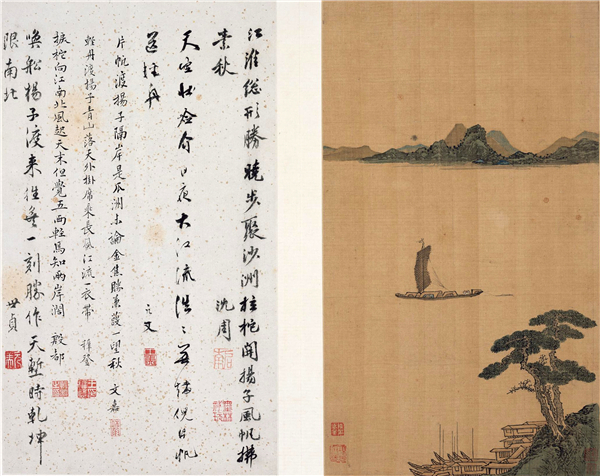 《两江名胜图册》是描绘长江淮河两岸名胜风景的册页,共十幅,每幅对页有沈周自题七绝一首,并有友人文嘉、王穉登等人题和诗,画面皆剪裁简明,情景融合。
