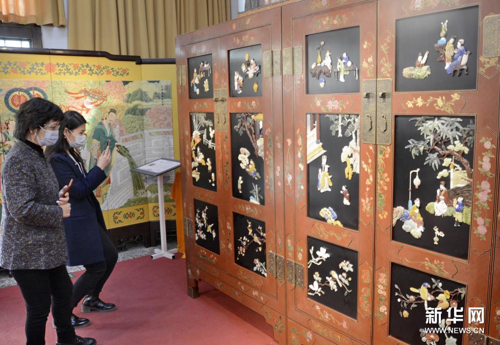 4月5日,观众在参观王学兵大师领衔制作的《仿清宫戗金彩绘百宝嵌方角柜》。新华社记者李欣摄