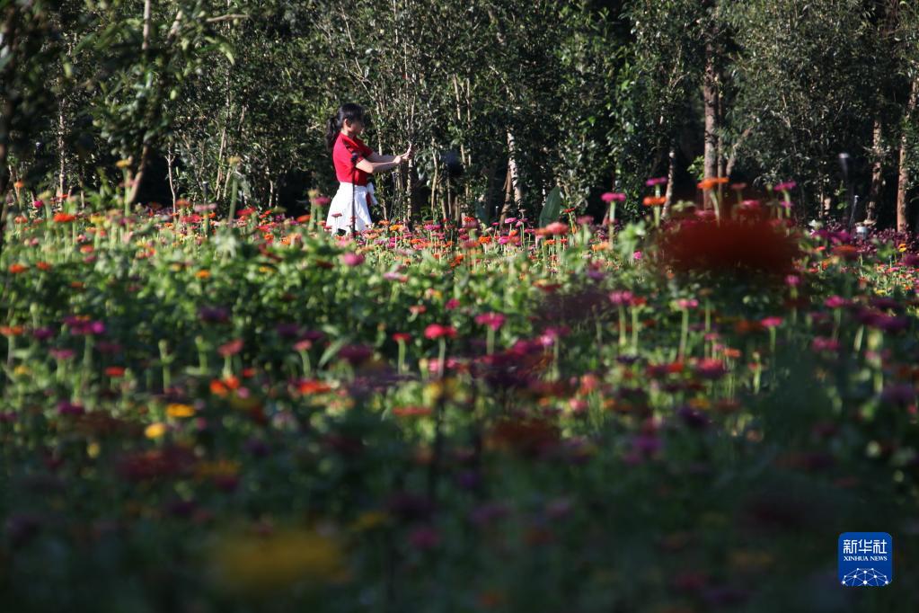 9月12日,行人徜徉在勐海县勐巴拉雨林小镇的花海中。