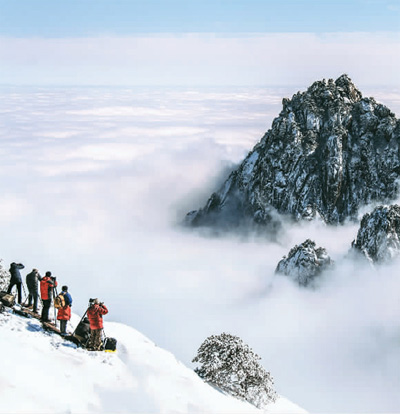 游客在拍摄冬雪和云海中的天都峰。梁军/摄