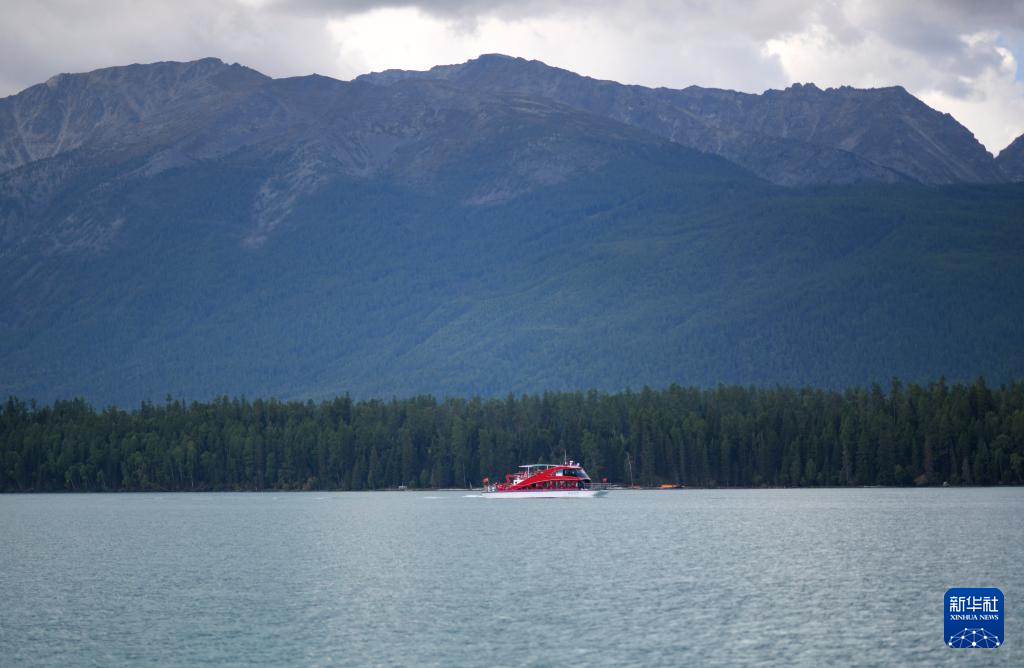 游客正在乘坐游艇在喀纳斯湖观赏风景(8月11日摄)。