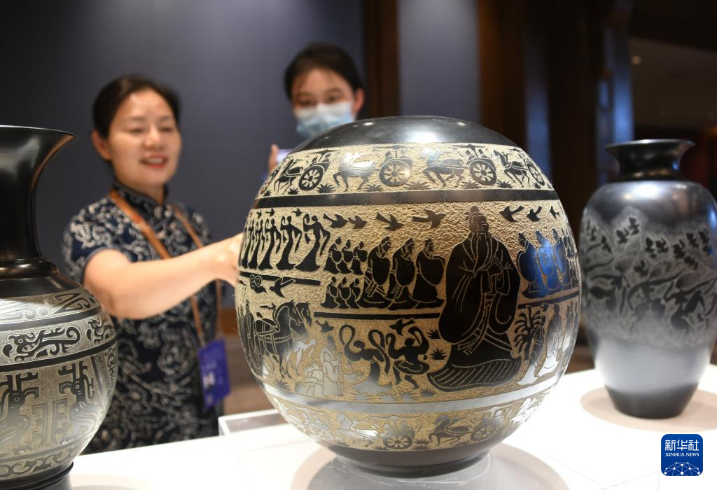9月26日,观众在观看一件刻有孔子像的黑陶作品。新华社记者 李紫恒 摄