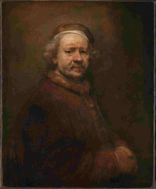作为艺术史上最著名的“自拍达人”,伦勃朗在其40年的职业生涯中,留下了超过80幅已知的自画像。翻阅这位艺术家的自画像作品,与今天浏览某人的社交媒体账号是类似的体验。从捕捉鬼脸的“快照”到细致刻画的坚韧造型,从素描、蚀刻版画到油画,伦勃朗的“账号”就是肖像画创作的实验乐园。而《63岁的自画像》就是这位“自拍达人”在去世前几个月最后的3幅自画像之一,以强烈的光影对比突出面容,用阔大的笔触和厚涂法,寥寥数笔便塑造出结实的块面,在一刹那便把内心全部的历史集中在脸上。