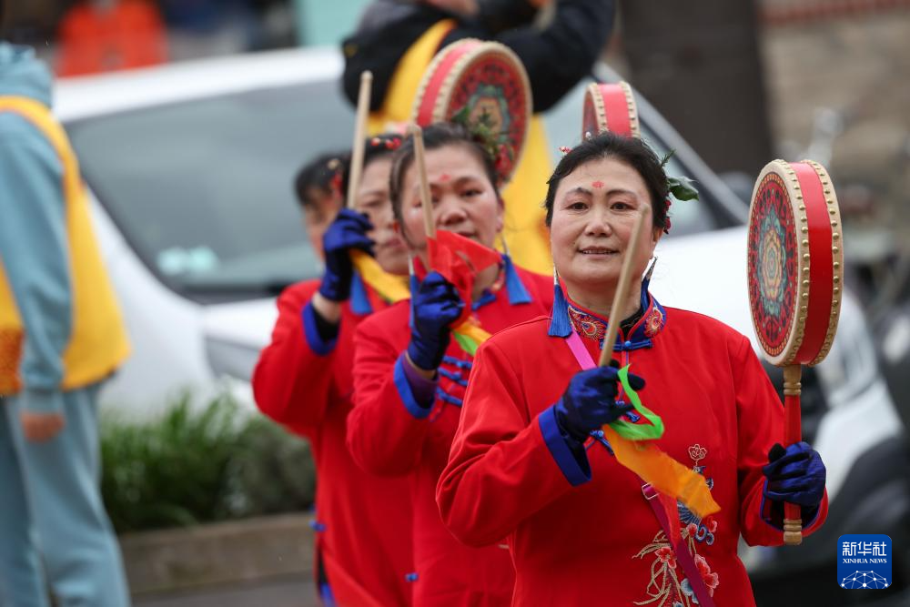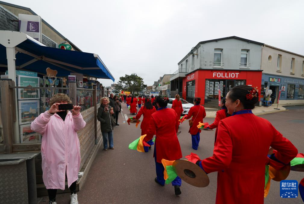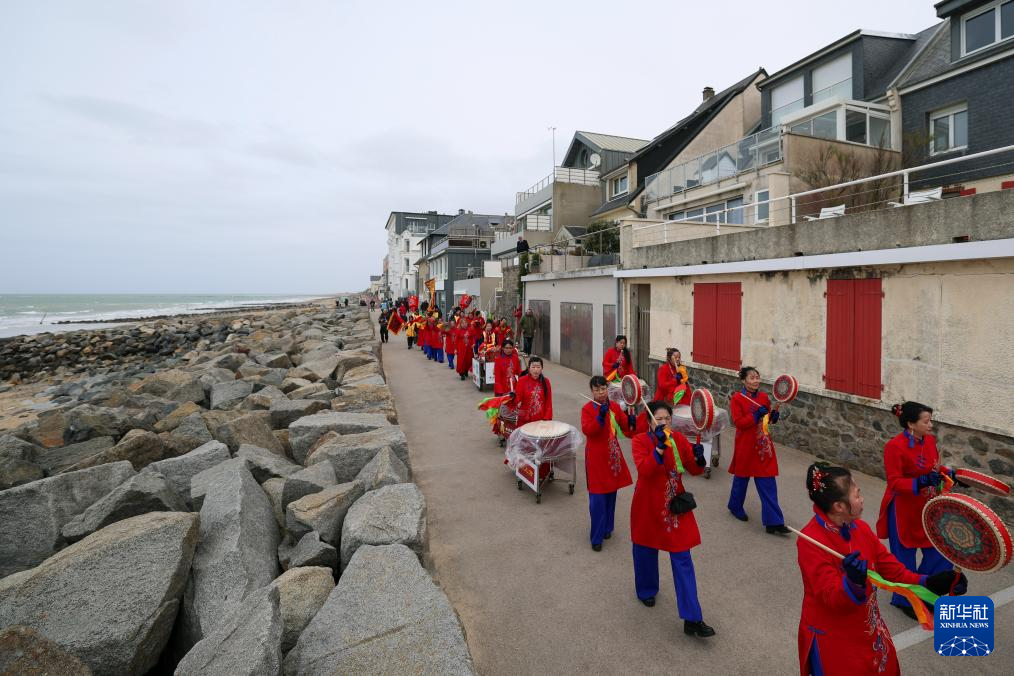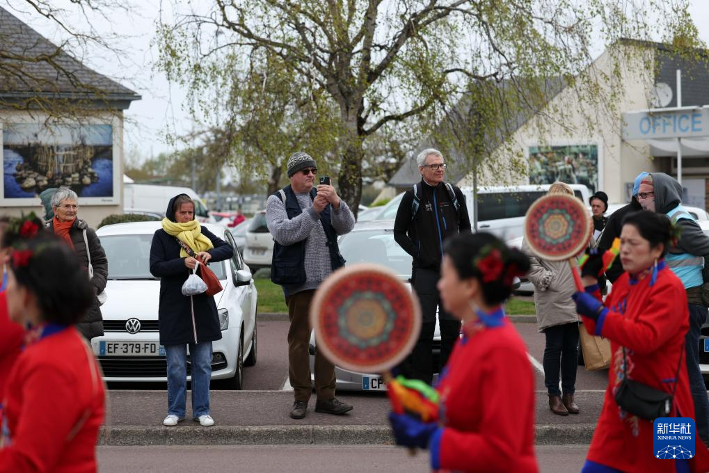4月11日,在法国诺曼底大区芒什省阿贡-库坦维尔,巡游队伍在妈祖巡游中表演。