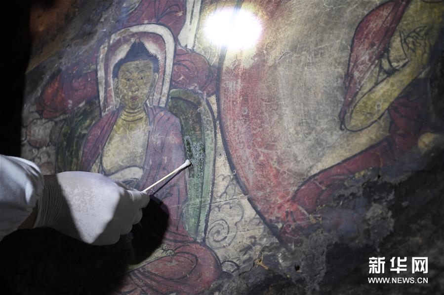 4月27日,文物修复专家在宁夏须弥山石窟圆光寺48号窟内修复壁画。新华社记者 冯开华 摄
